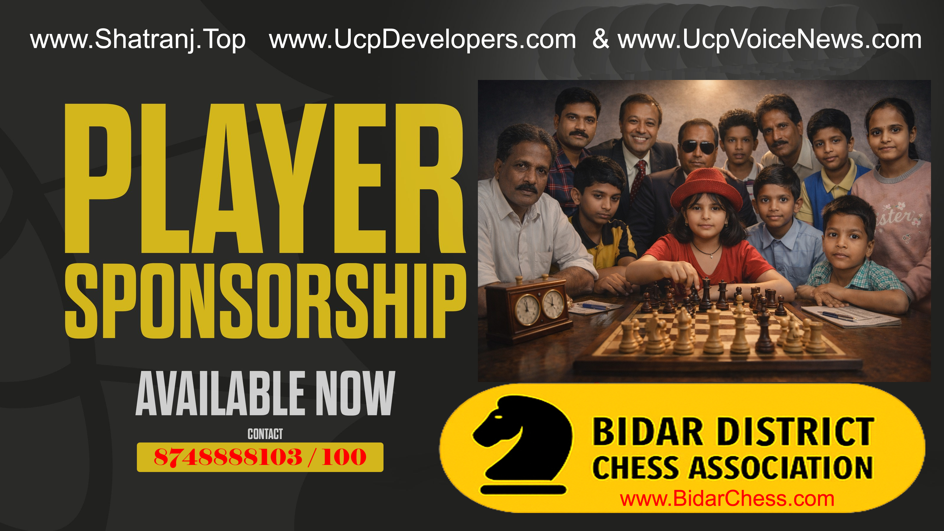 RAJSHEKHAR GAJLE Sponsored By: Bidar District Chess Association, 2012 and UCP Voice News. REASON : BLITZ Shatranj Rated BDCA Tournament Winner 2024-2025 & Prizes WON in previous Tournaments org.by Chaduranga & BDCA. |